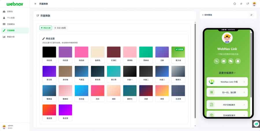 ** 预设主题 **:多套风格卡片,点击即用,并会持久化记录当前主题。